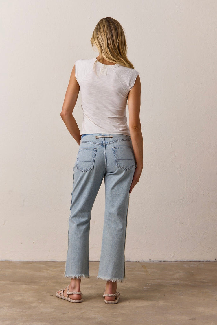 The Chloe Muscle Tee in Soft White is a core NSF women’s essential, offered year-round in lightweight slub cotton jersey. Designed with raglan cap sleeves, a slim fit, and raw edge finishing, it blends a feminine silhouette with just the right amount of edge. Subtle distressing at the neckline and textured slub fabric give it a cool, lived-in look that’s perfect for everyday wear.