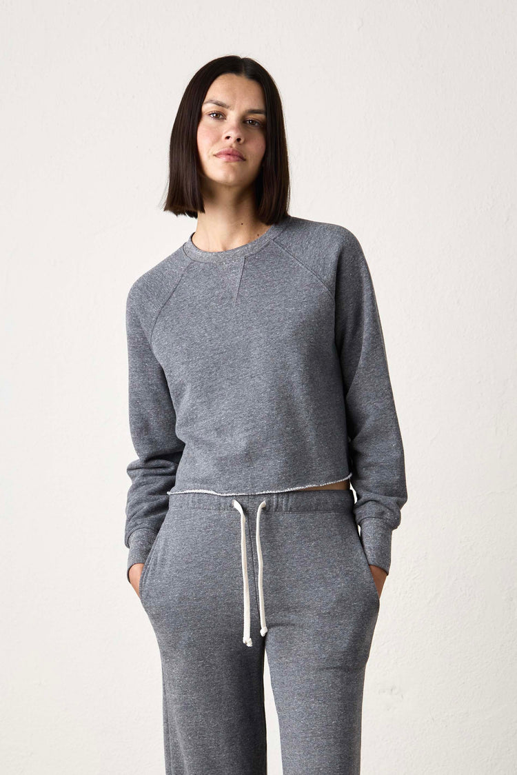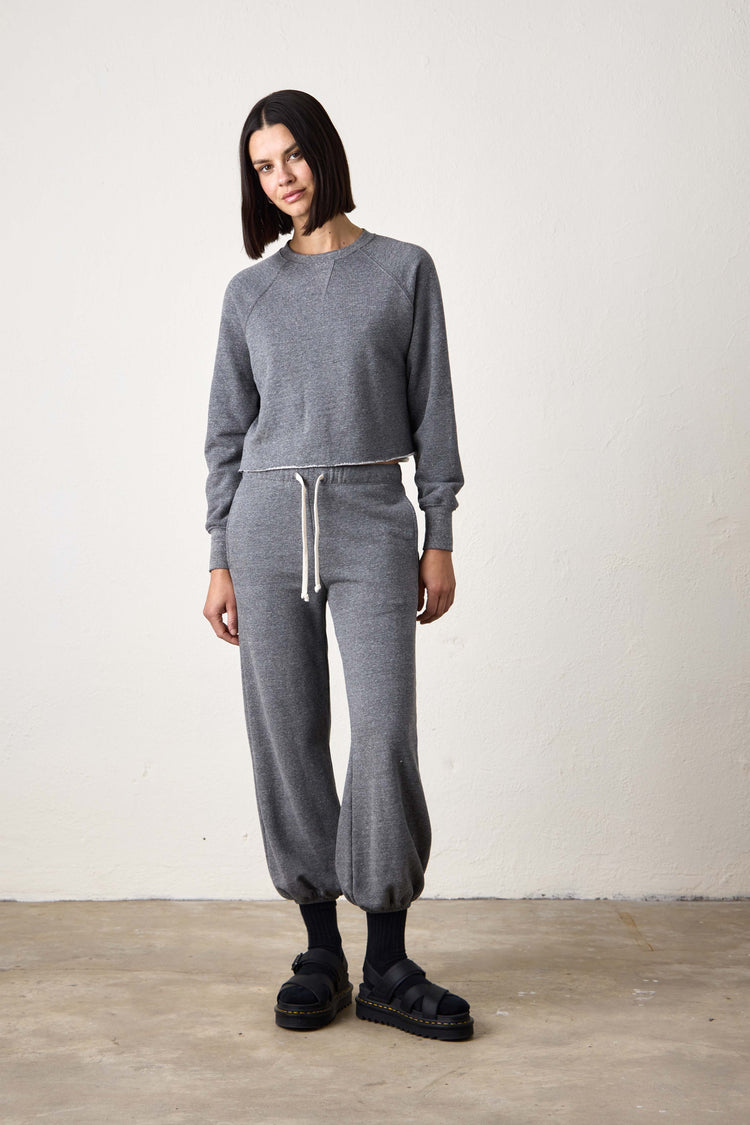 Drawing inspiration from a classic menswear raglan crew-neck sweatshirt, this slightly cropped piece features a raw-cut hemline that adds a touch of edgy femininity. The relaxed silhouette perfectly blends traditional structure with modern boy-meets-girl style crafted in our signature 3-end loop back French terry fabric.