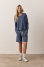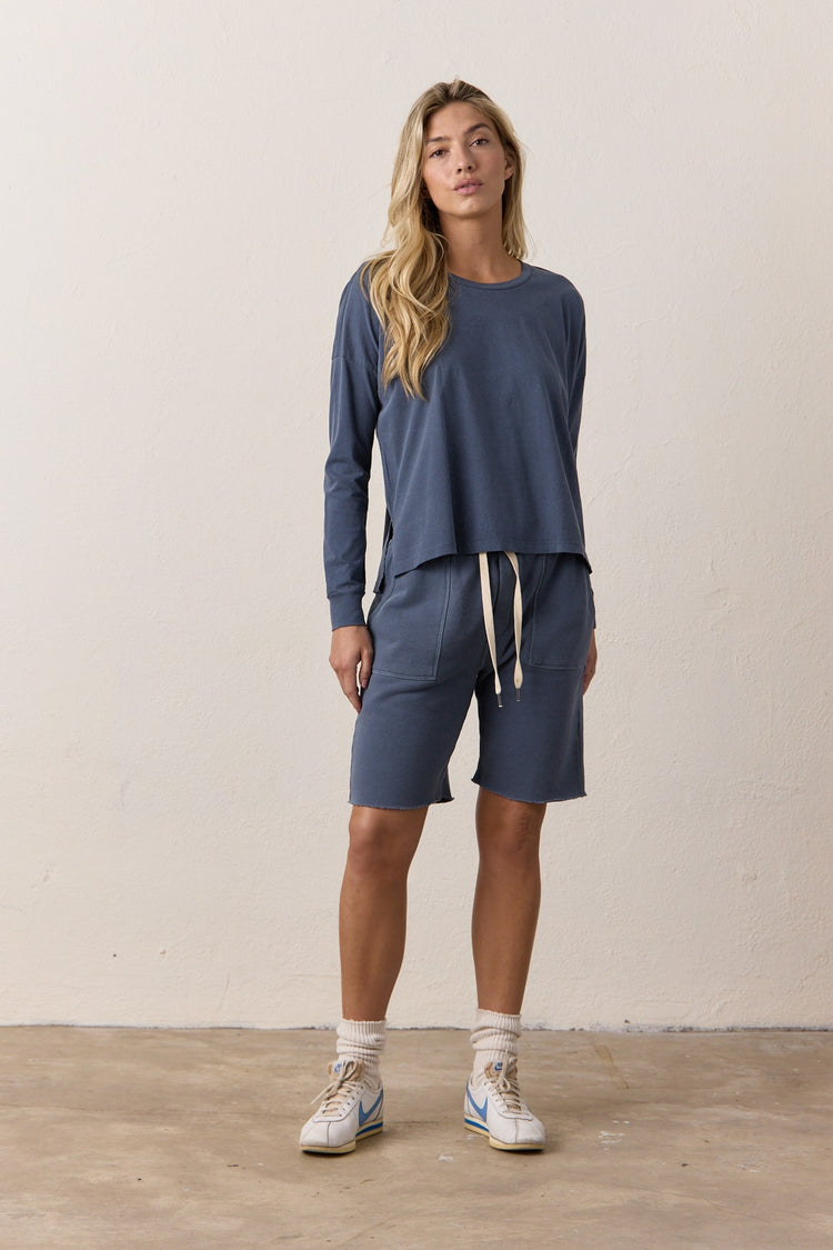 The NSF Abby Loose Fit Tee in Faded Neo Blue is a soft, lightweight long sleeve women's top made from 100% fine cotton jersey. Designed with a relaxed boxy silhouette and slim-fitting sleeves and features side slits for a modern drape with a barely-there feel. The clean, faded blue hue and subtle texture give it a minimalist look that’s easy to style and endlessly wearable.