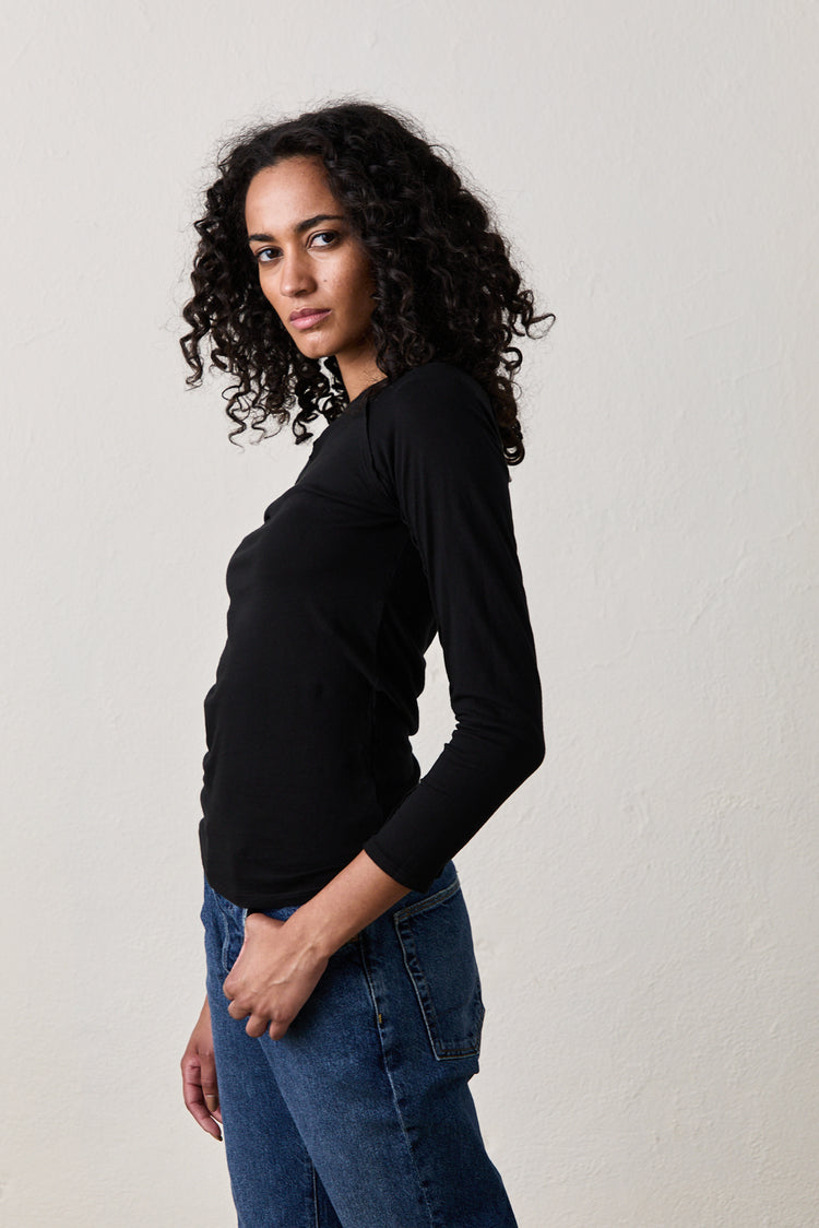 Our new slim fitted seamed raglan crew. Made in a light weight combed cotton jersey and garment dyed.