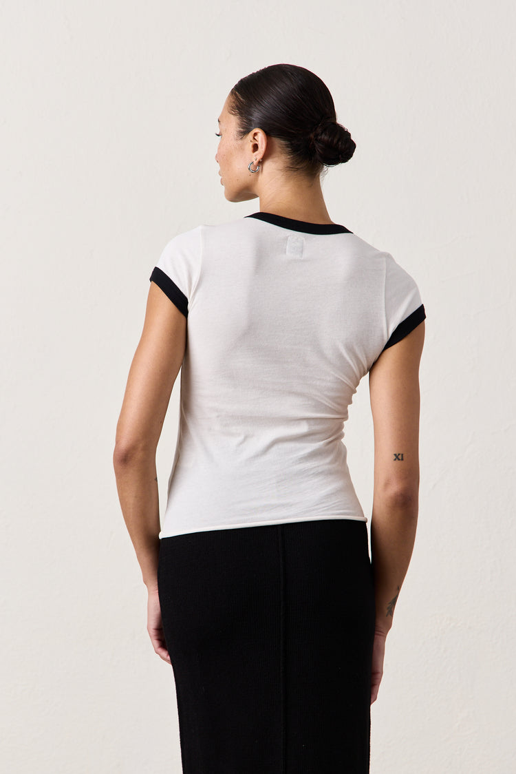 A vintage-inspired shrunken ringer tee with a snug fit, contrasting trim, and a playful, laid-back vibe. Perfect for layering or wearing solo!