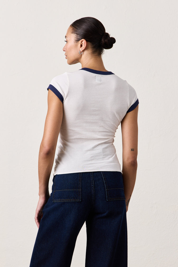 A vintage-inspired shrunken ringer tee with a snug fit, contrasting trim, and a playful, laid-back vibe. Perfect for layering or wearing solo!