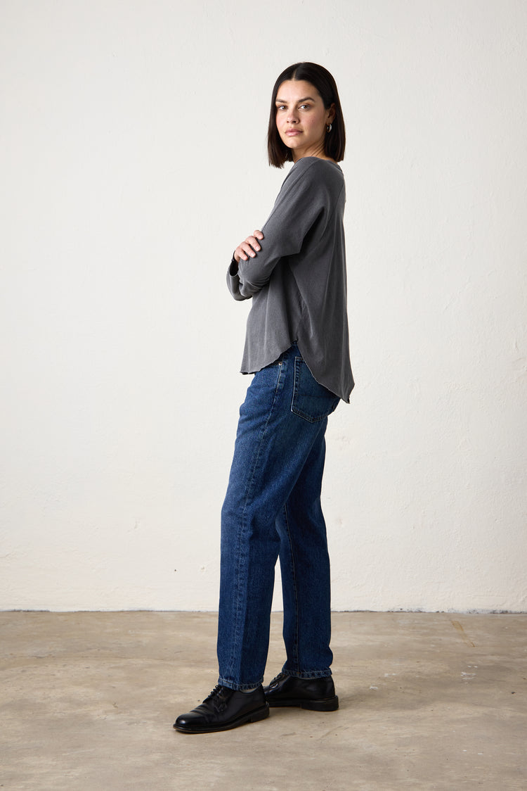 A lightweight essential with dolman shaped long sleeves, a wide crew neck, and a relaxed loose fit, that drapes effortlessly. The curved raw edges for that NSF signature touch adds that lived-in vibe. Perfect for layering or wearing solo.