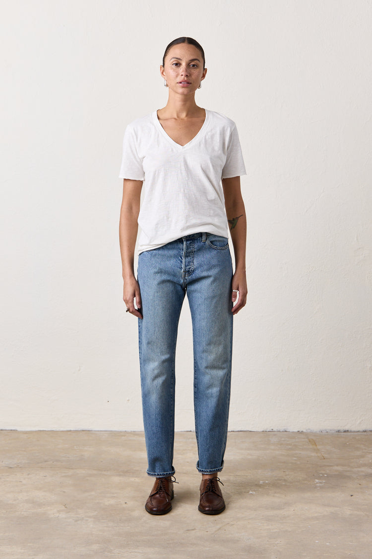 Full body front view of model inside wearing the Alessi tee in soft white and the Owen jean.