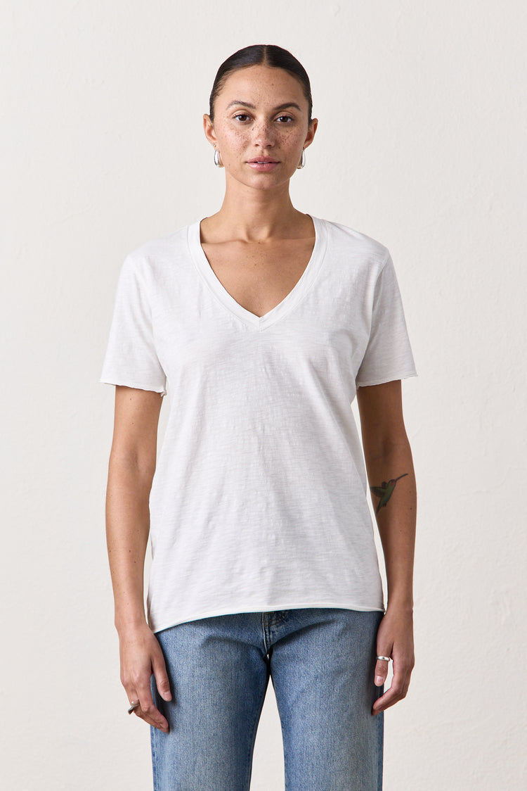 A vintage-inspired V-neck tee made from a soft slub jersey.  Featuring a long, relaxed fit, it's versatile enough to dress up or down.