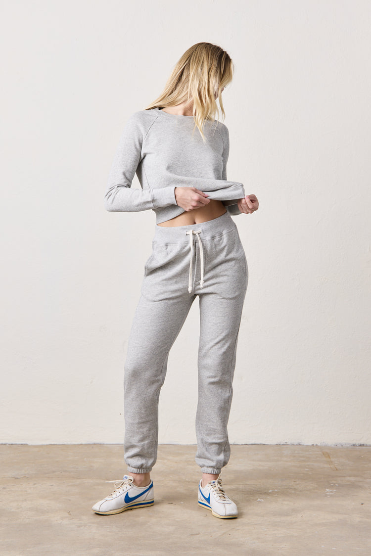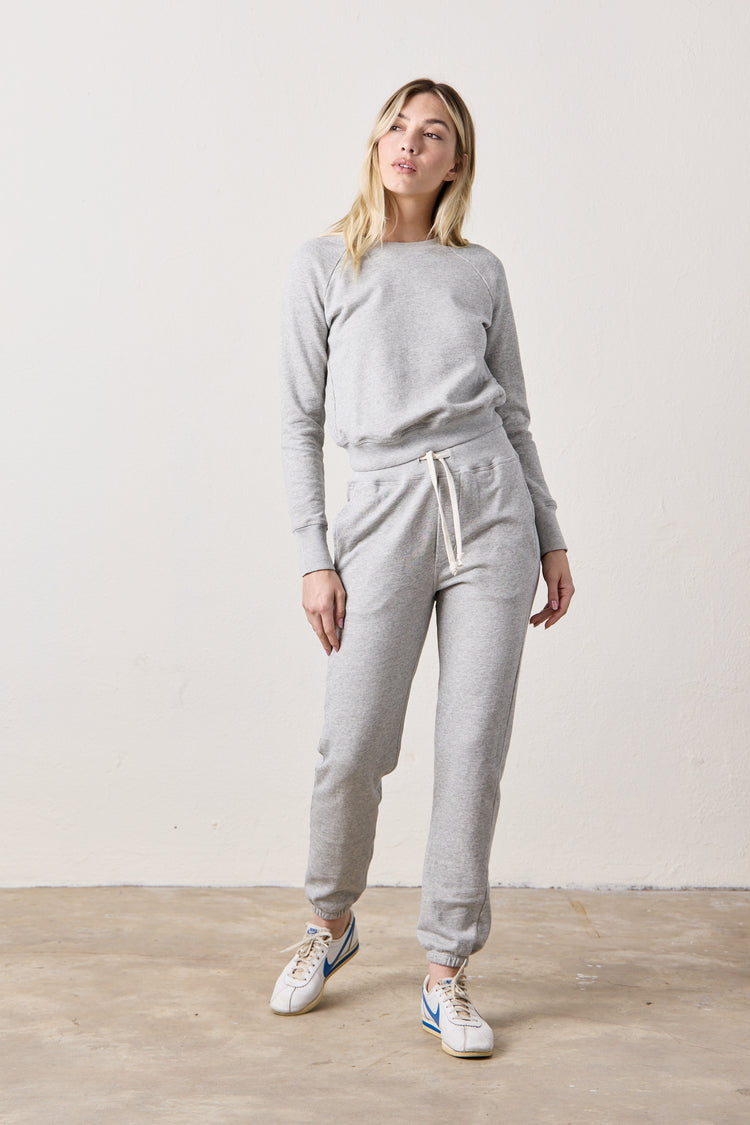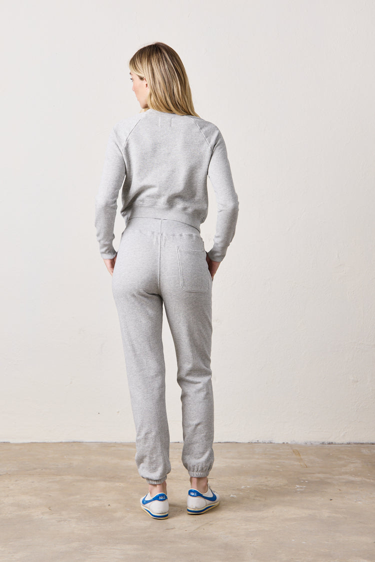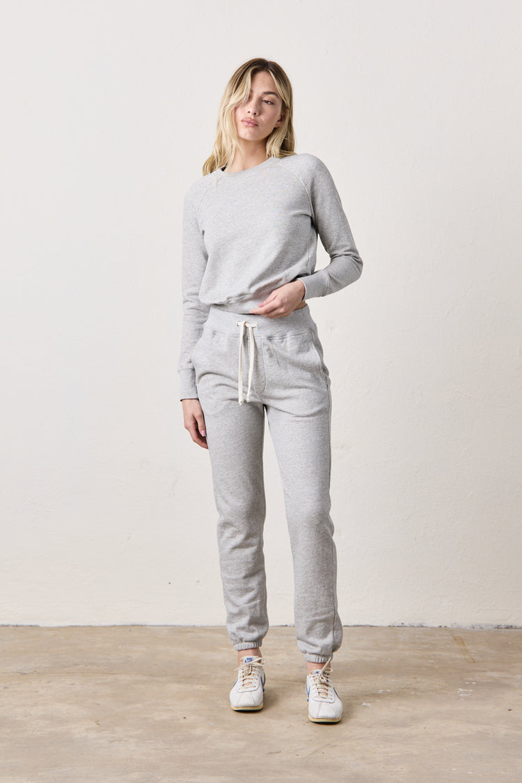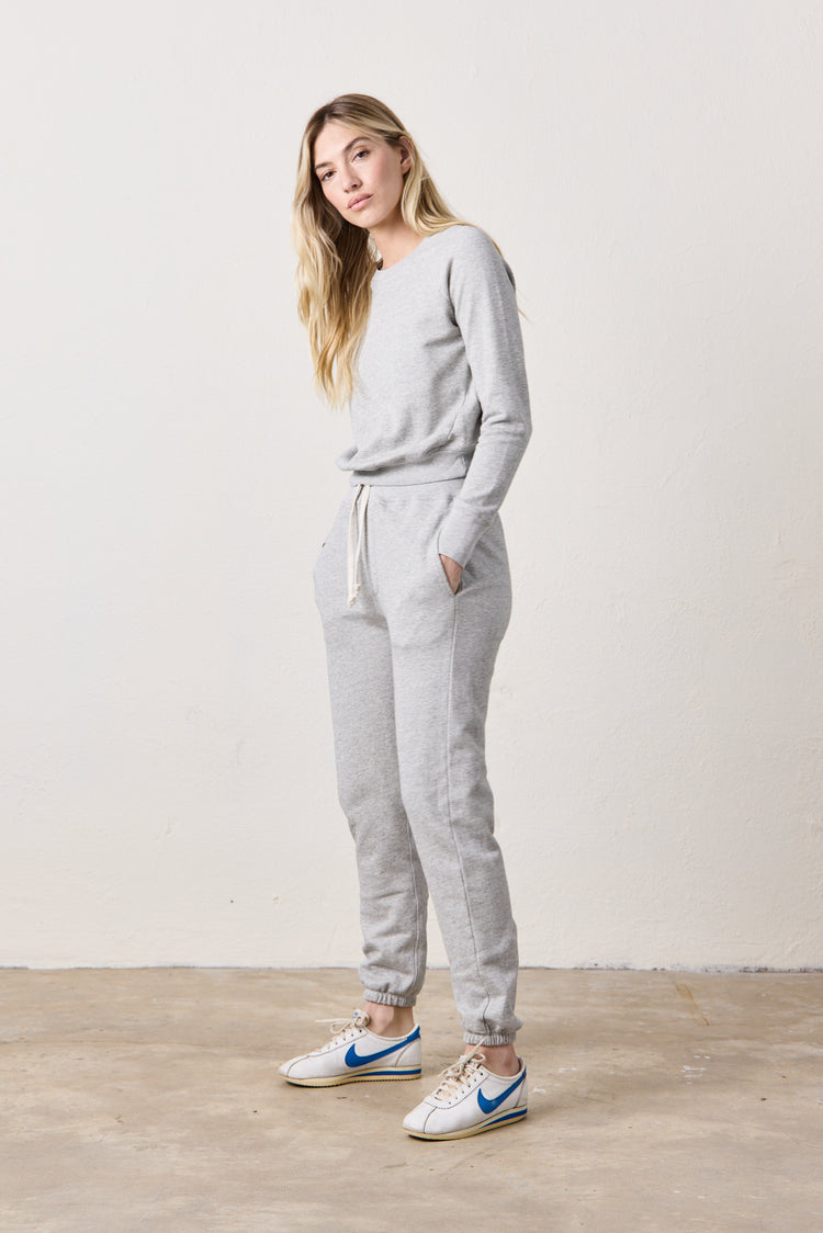 The NSF Isabella Sweatpant is a women's high-rise, straight-leg lounge essential made in our signature 3-end loopback French terry. Designed with a ribbed elastic waistband, drawstring tie, and elastic cuffs, it offers a relaxed fit with subtle structure. The vintage heather grey wash adds a soft, lived-in finish—perfect for pairing with your go-to hoodie or tee.
