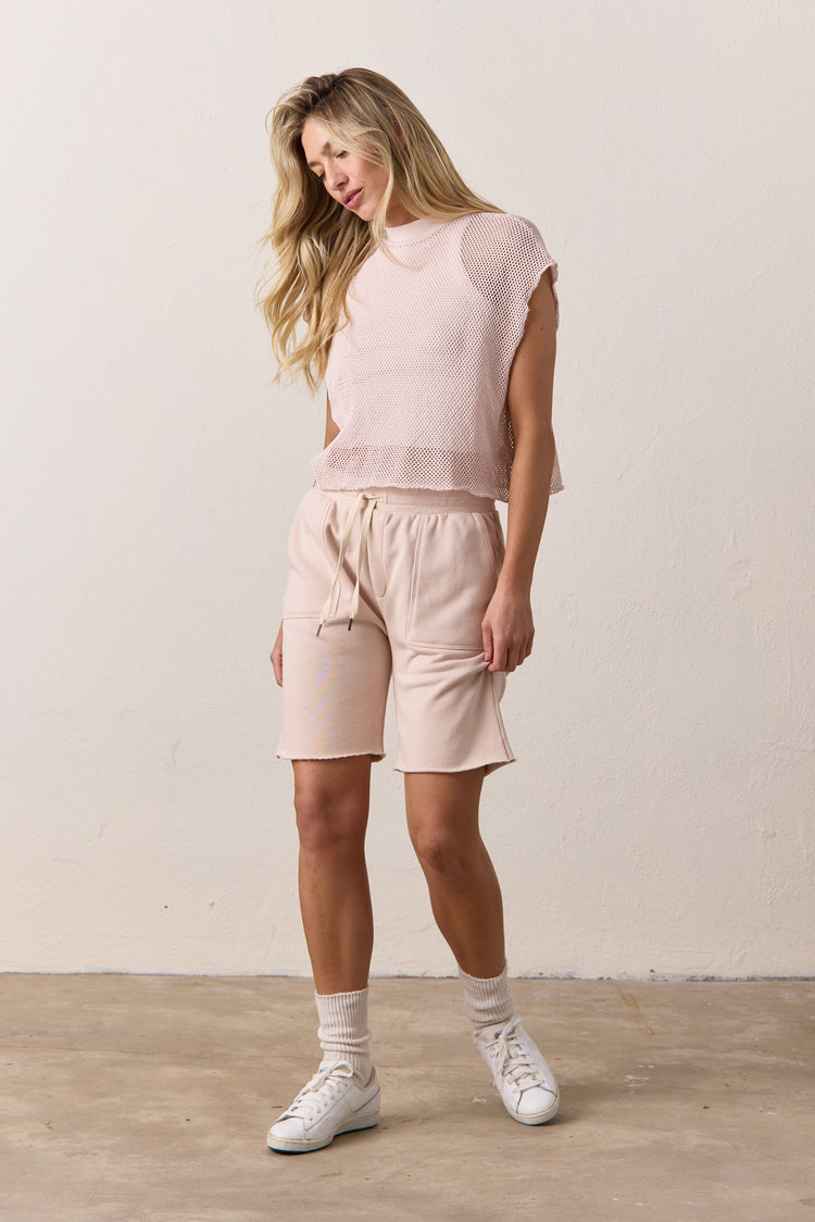 The Women’s Jen Short in Pearl Pink brings a soft, feminine twist to your off-duty look. Made from our signature 3-end loop back French terry, it features front pork chop pockets, a raw hem, and an adjustable drawstring waist. The subtle pink tone makes it an easy, elevated alternative to your everyday sweatshort.