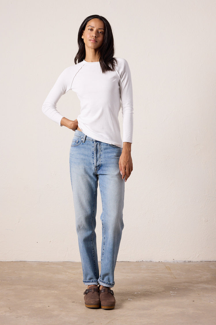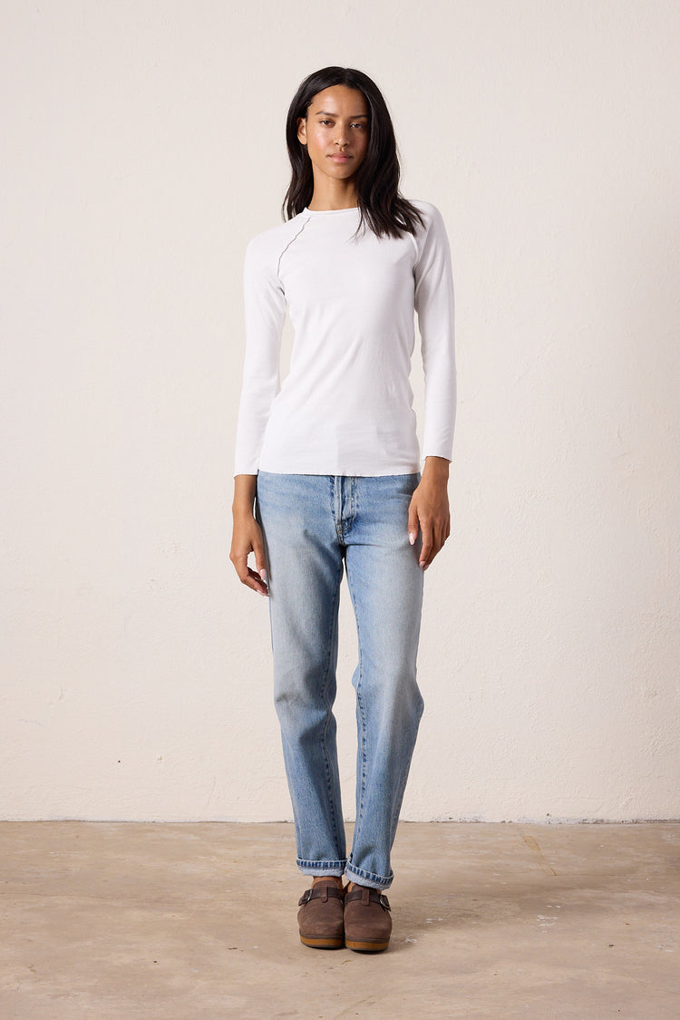 Meet your new everyday staple, the NSF Aria Fitted Baby Rib Raglan Tee in Chalk. Crafted in soft 1x1 mini rib cotton with a slim, flattering fit, this tee features signature reversed shoulder seams, raw edges, and bracelet-length sleeves for that effortless, lived-in look. Made to layer and wear all year round.