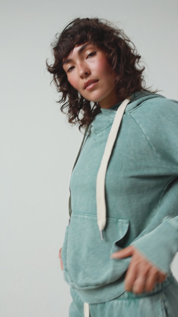 Our women’s NSF Lisse Fitted Loop Terry Hoodie in Teal Heather is crafted with a perlite-dye process for a soft, broken-in vintage finish. Designed in a flattering slim fit, it features a double-layered oversized hood and a front pocket for everyday functionality. Cut from our premium 3-end loop back French terry, it’s breathable, lightweight, and endlessly wearable season after season.