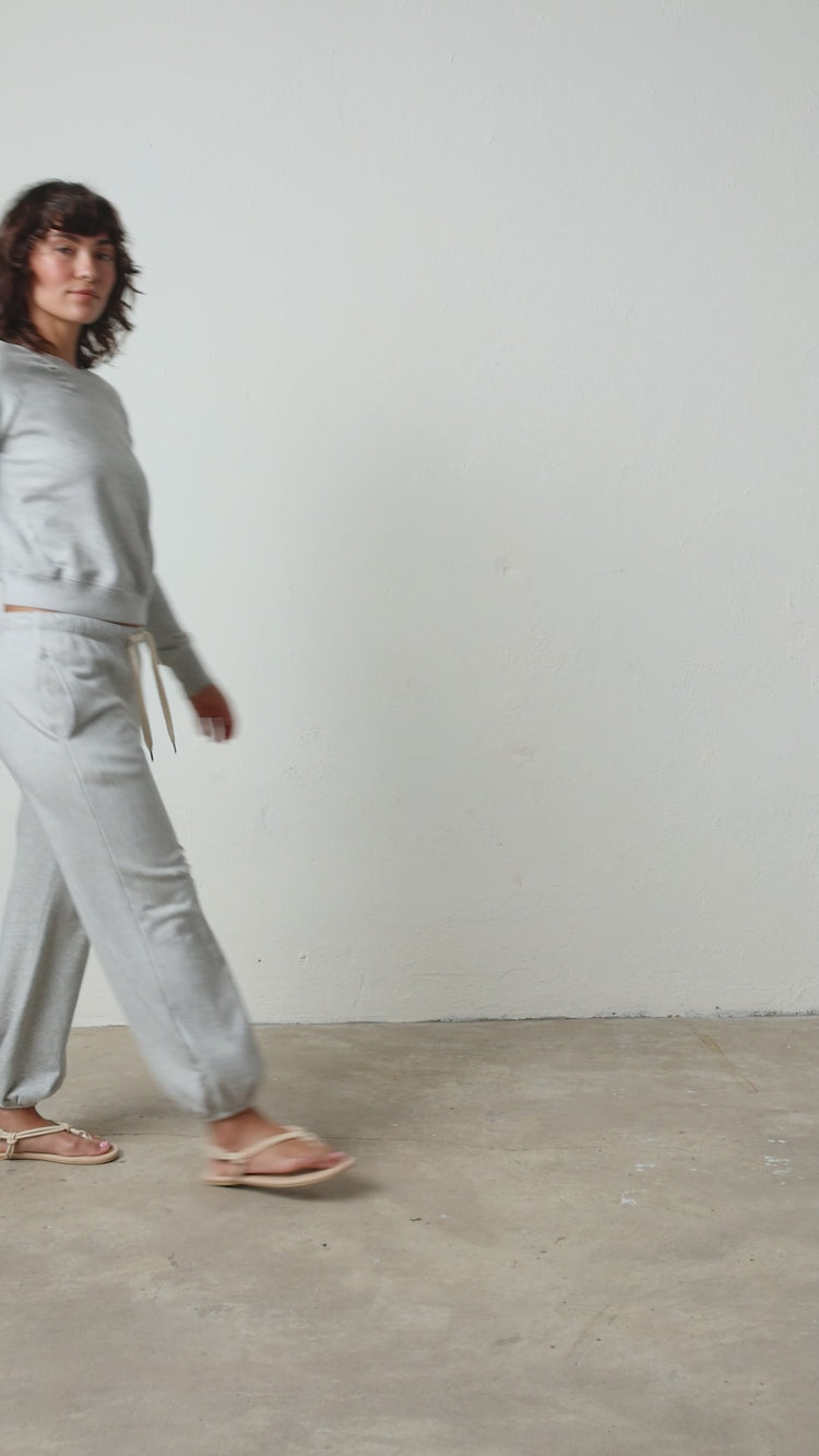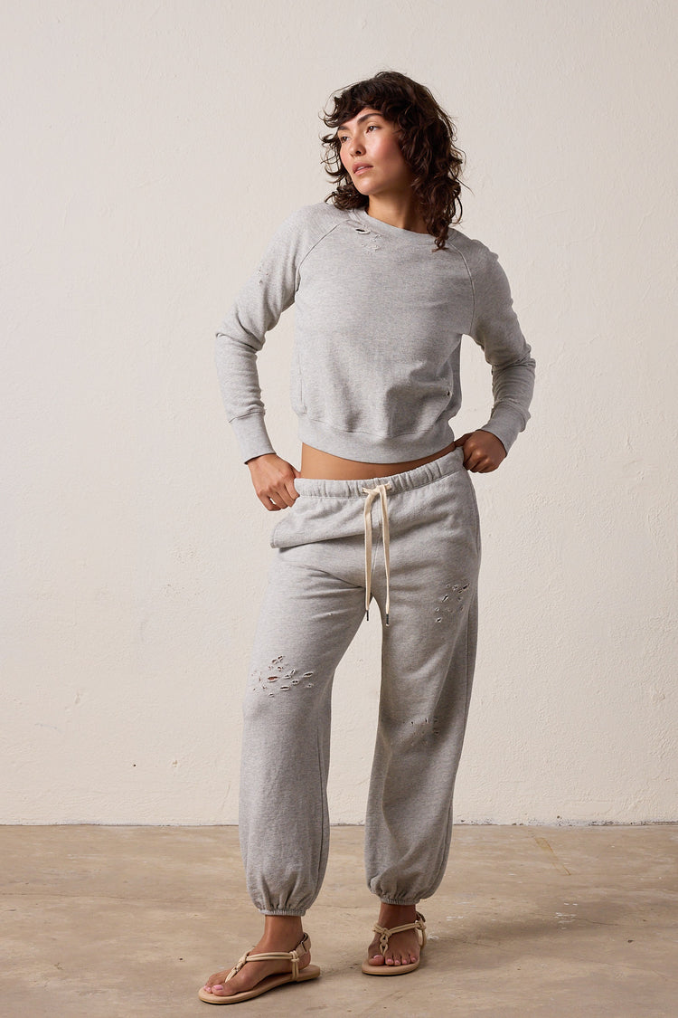 The NSF Shane Billow Sweatpants in Vintage Heather Gray is reworked with hand-applied deconstruction as part of our Torn group.