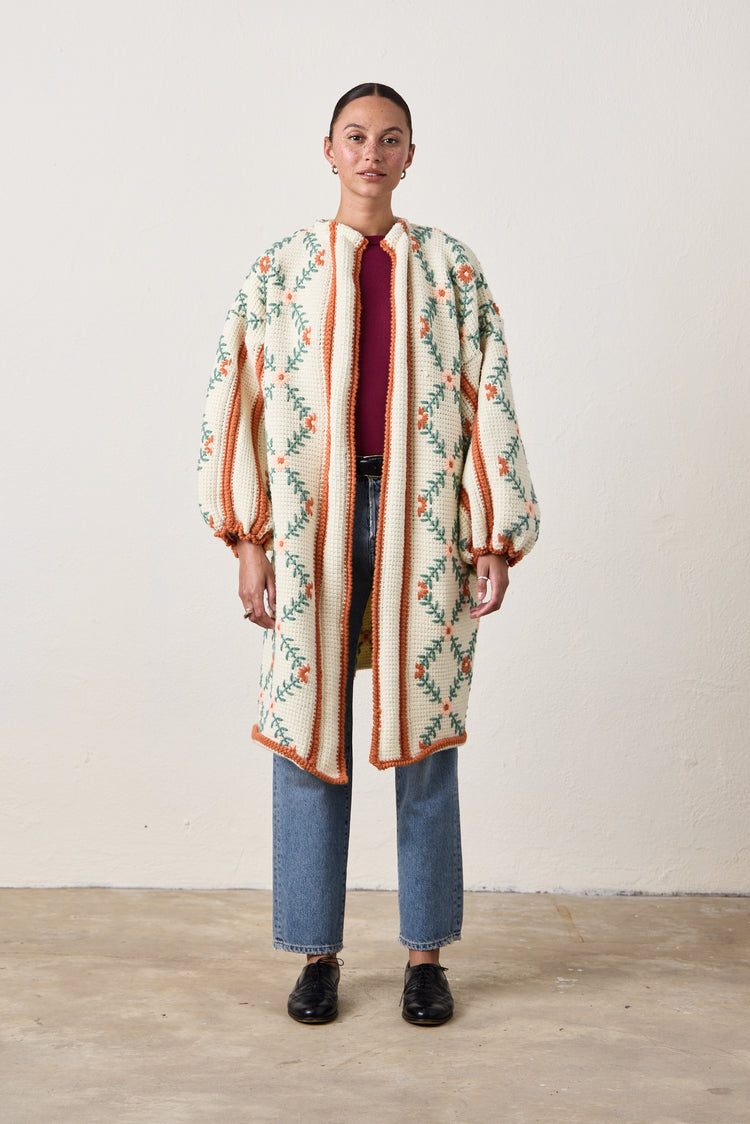 A Collaboration with Nichole Shawn Moss, a mother, marketer and dress line maker- These vintage hand-crocheted blankets are lovingly knitted by moms and grandmas of generations past. Our one-of-one, reimagined elegant cocoon jackets breathe new life into cherished memories, preserving the tradition of handmade craftsmanship.