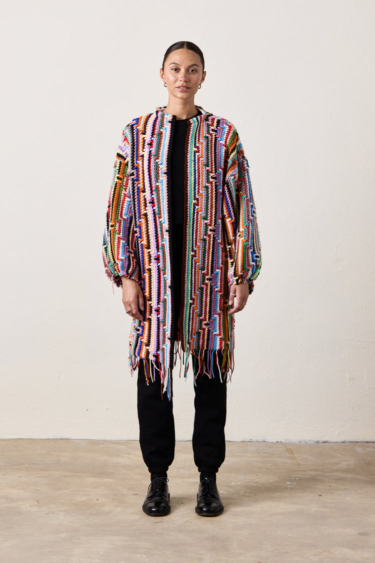 A Collaboration with Nichole Shawn Moss, a mother, marketer and dress line maker- These vintage hand-crocheted blankets are lovingly knitted by moms and grandmas of generations past. Our one-of-one, reimagined elegant cocoon jackets breathe new life into cherished memories, preserving the tradition of handmade craftsmanship.