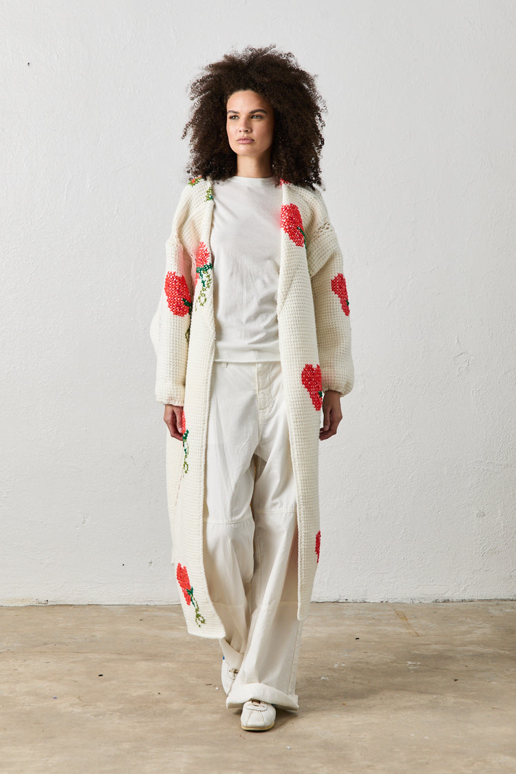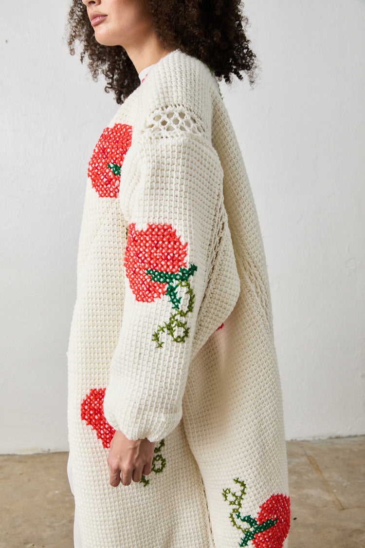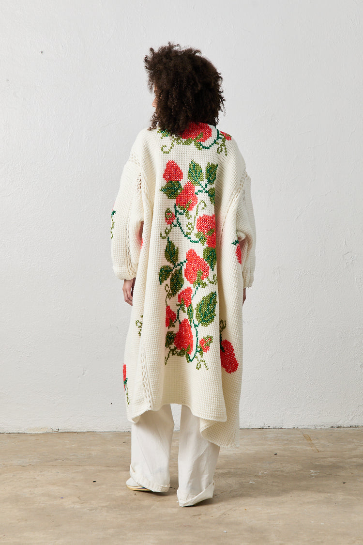 A Collaboration with Nichole Shawn Moss, a mother, marketer and dress line maker- These vintage hand-crocheted blankets are lovingly knitted by moms and grandmas of generations past. Our one-of-one elegant cocoon jackets breathe new life into cherished memories, preserving the tradition of handmade craftsmanship.