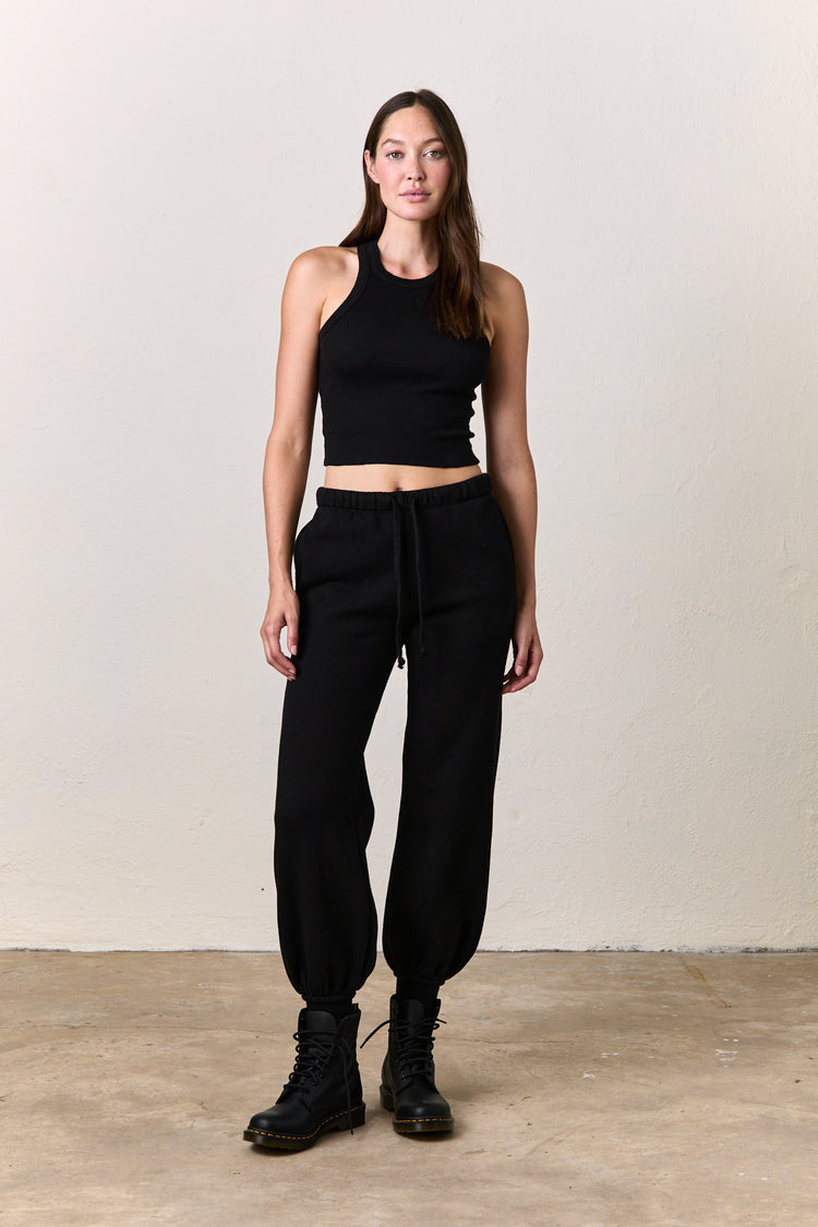 Our chic mid-waist jogger has a slightly cropped billowed leg and an elastic drawstring waist. Crafted in super soft heavyweight fleece fabric and garment dyed.